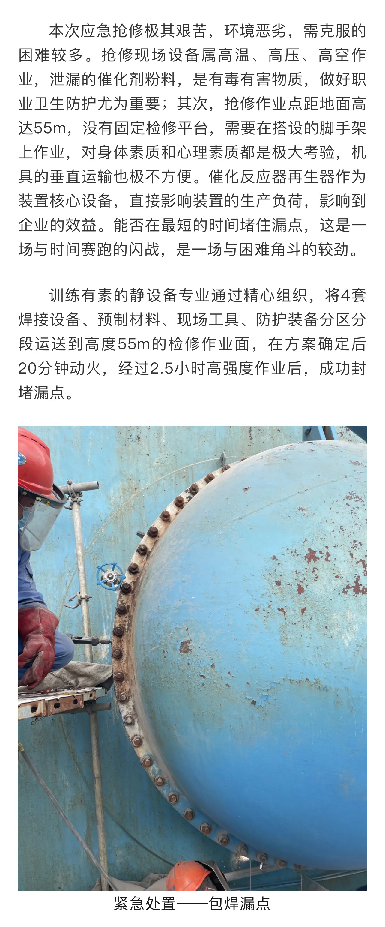 洋浦分公司高強(qiáng)度作業(yè)2.5小時(shí),成功堵住再生器漏點(diǎn)