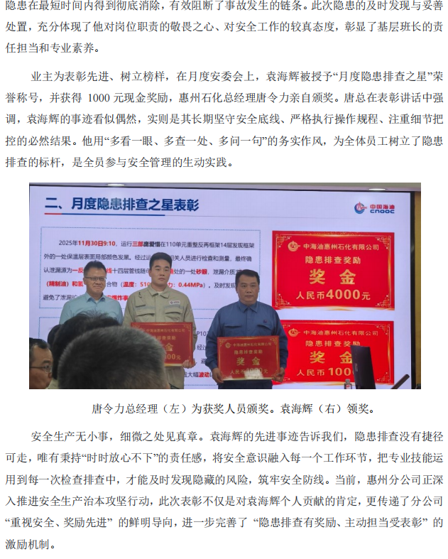 惠州分公司袁海輝隱患排查獲獎勵